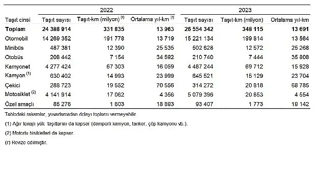 Taşıt-kilometre İstatistikleri, 2023