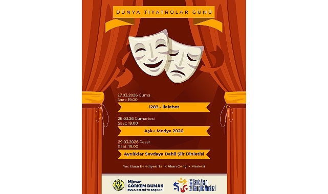 Buca Belediyesi, Dünya Tiyatrolar Günü’nü muhteşem bir programla kutlamaya hazırlanıyor. 27-29 Mart tarihleri arasında gerçekleşecek olan etkinliklerde  Bucalı sanatseverler tiyatro ve şiirin büyüleyici atmosferinde bir araya gelecek. Buca Belediyesi Tarık Akan Gençlik Merkezi’nin ev sahipliği yapacağı program kapsamında; 27 Mart Cuma saat 19.00’da “1283 – İlelebet”, 28 Mart Cumartesi günü saat 19.00’da “Aşk-ı Medya 2026” isimli tiyatro oyunları sahne alırken 29 Mart Pazar günü saat 19.00’da “Ayrılıklar Sevdaya Dahil” şiir dinletisi gerçekleştirilecek.